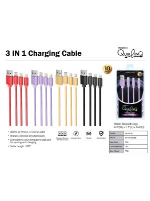 - 10 FT. 3 IN 1 (1 IPHONE, 1 TYPE C, 1 MICRO) - 4 ASSORTED COLORSSKU - MAXX-NV-08118CAUPC No. - 841437152401Location - ROOM #3Add to Wish ListAdd to CompareAvailability - Out of StockPlease click to add to wishlistPieces in cart - 0
