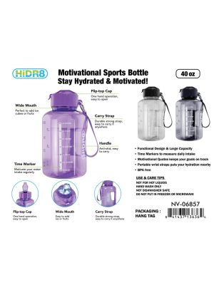 - MOTIVATION WATER BOTTLE ASSORTED COLORS - 40 OZ.SKU - MAXX-NV-06857UPC No. - 841437136364Location - ROOM 1Add to Wish ListAdd to CompareAvailability - Out of StockPlease click to add to wishlistPieces in cart - 0